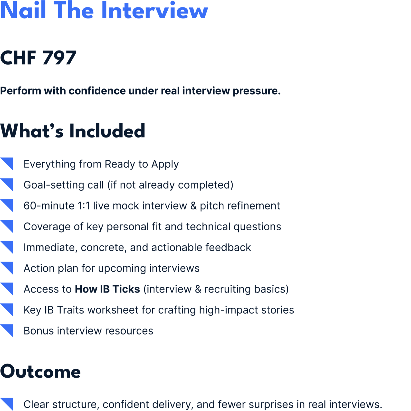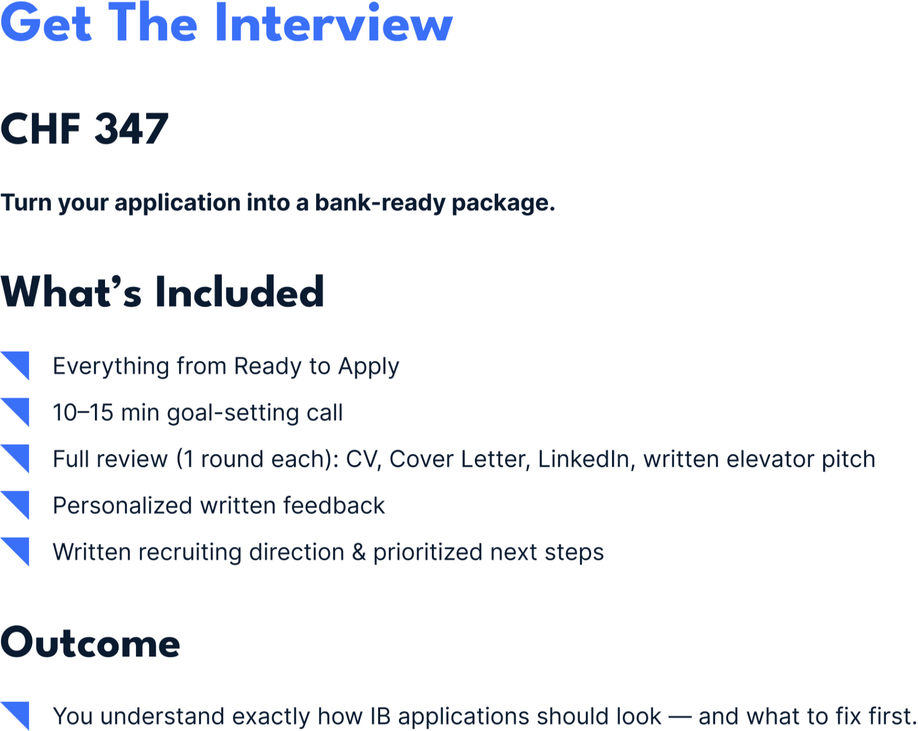 My online courses give you the foundation. Coaching is where we apply it directly to you. Every candidate is different — background, CV gaps, interview style, confidence, timing. The coaching programs are designed to remove blind spots, accelerate progress, and give you clear, honest feedback based on how Swiss IB recruiters and interviewers think. I offer targeted execution rather than generic advice — focused on your profile, your timing, and your specific gaps.
