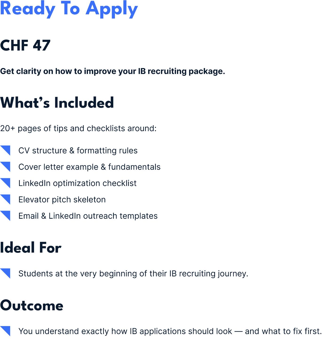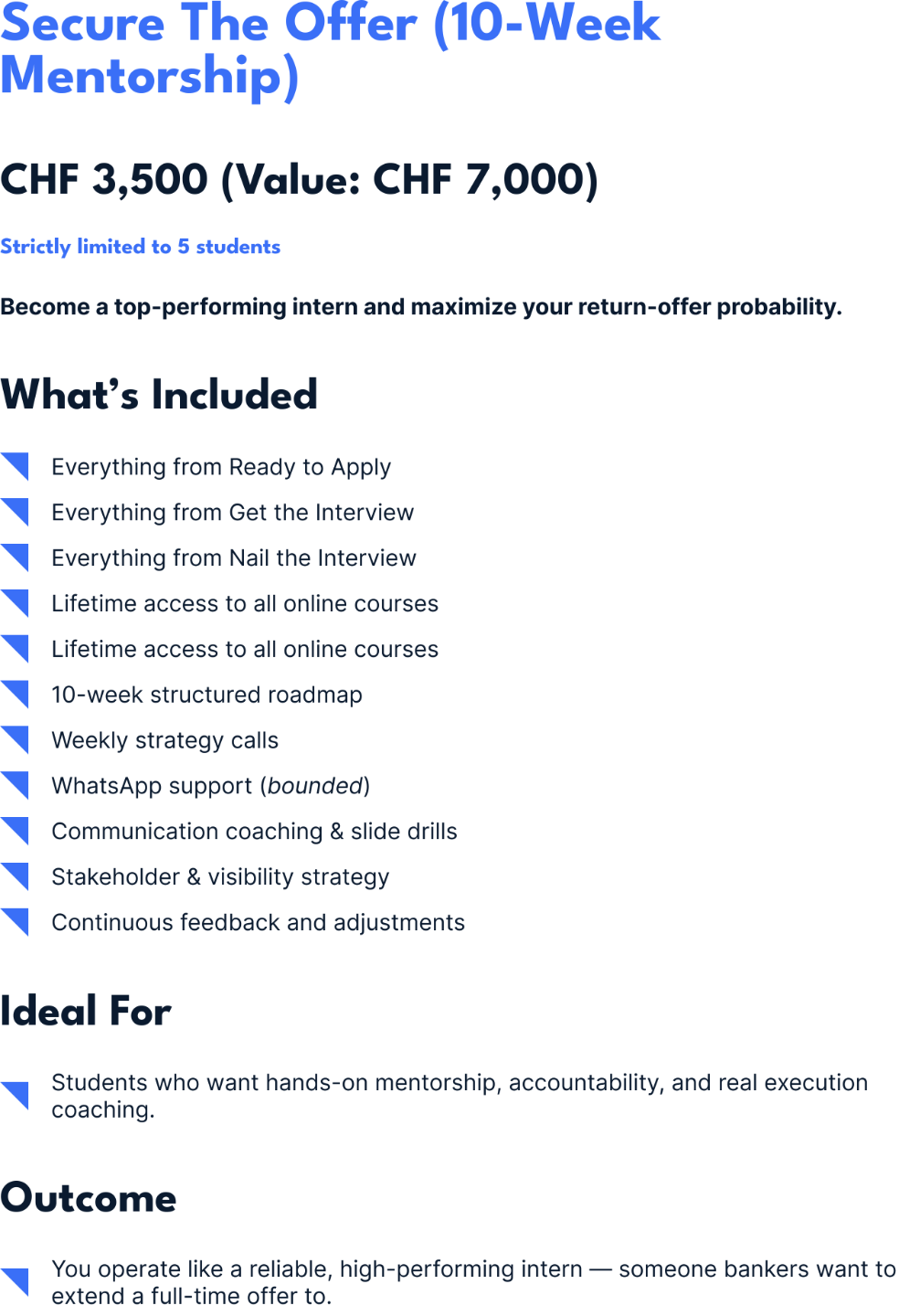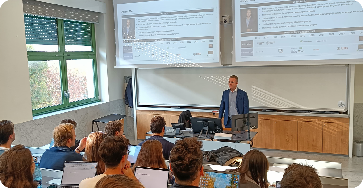 I built from scratch and held a 10-week intern development program at UBS, taught and coached students from HSG and Bocconi, and now I focus on helping motivated candidates break into Swiss Investment Banking.