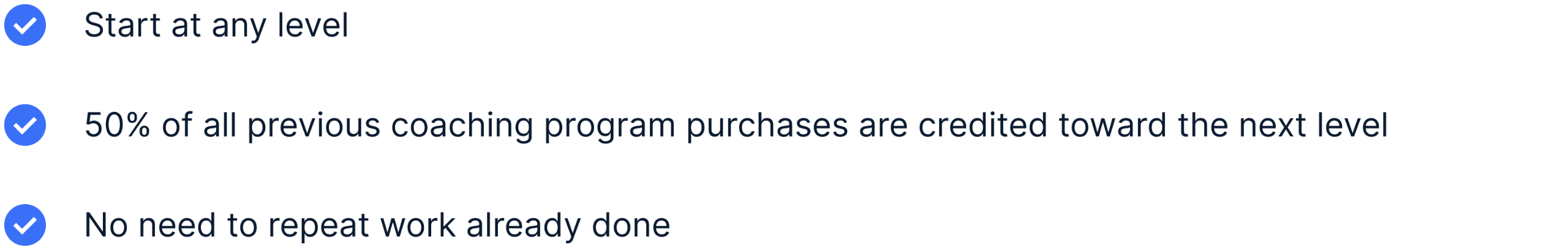 (50% of all money paid on previous coaching programs is credited toward the next level.)